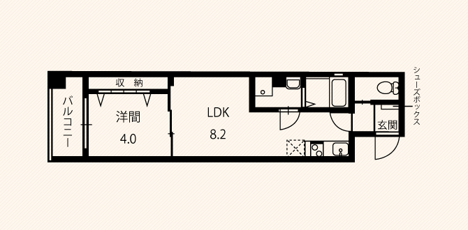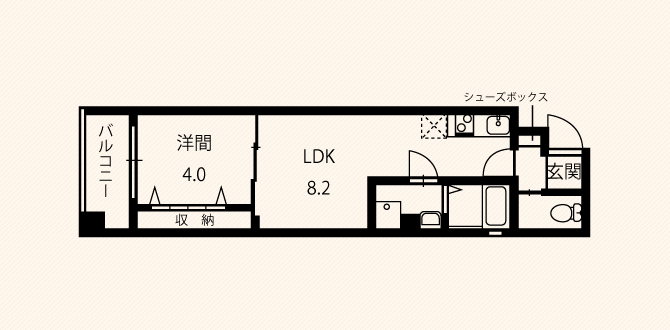 - 1DK(キッチン8.0~10.3畳、リビング4.0~4.3畳、バルコニー有、全室角部屋)