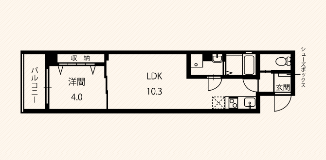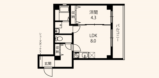 - 1DK(キッチン8.0~10.3畳、リビング4.0~4.3畳、バルコニー有、全室角部屋)